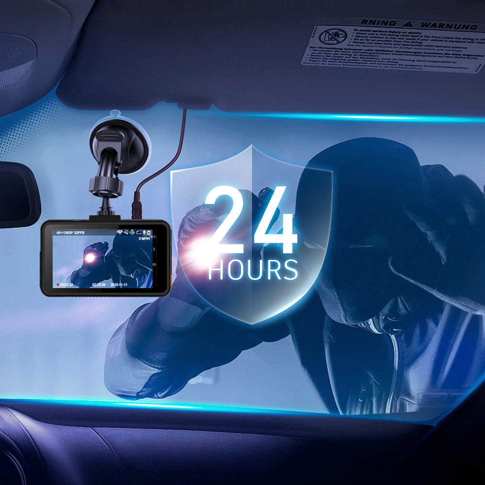 24-timers parkeringsmonitor er drevet af et indbygget batteri. Hvis nogen rammer din bil, og kollisionen når G-sensorniveauet, tænder kameraet og optager 1 minuts video, låser og gemmer.