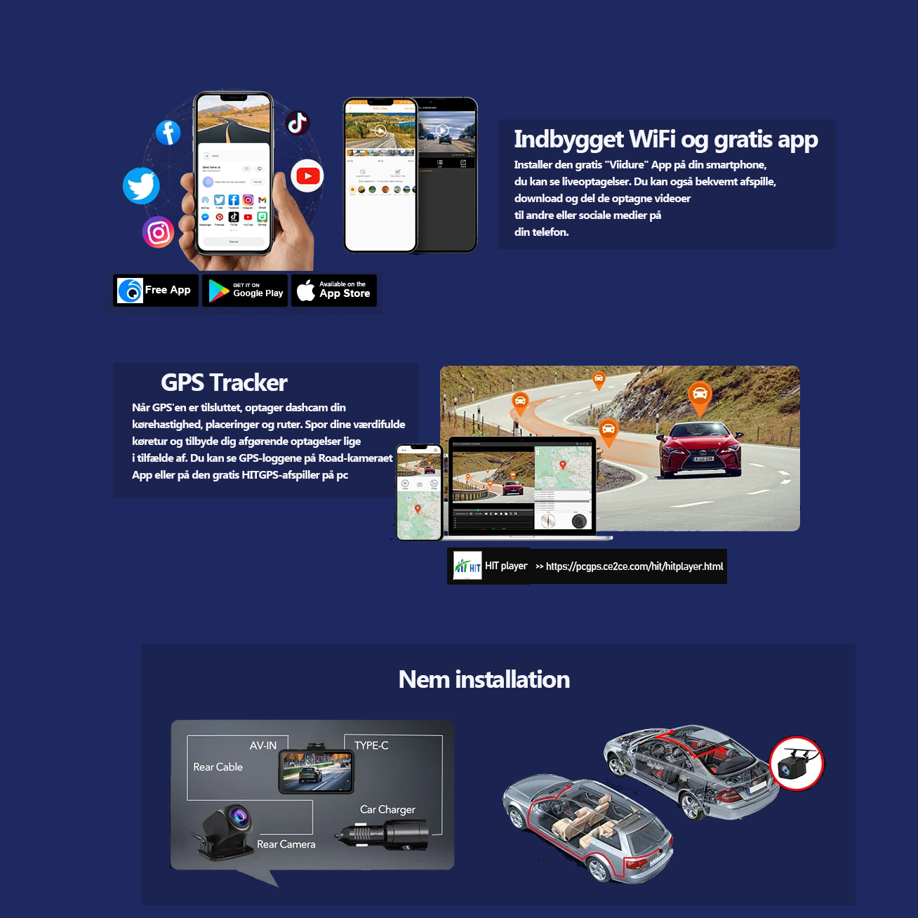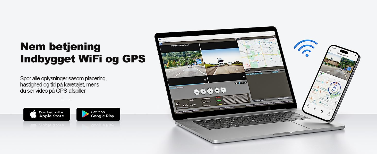 • Funktioner: Wifi/GPS/ADAS/G-Sensor/Stemmemeddelelse/One-tast optagelse/One-key lock/One-key shutdown/Reverse fuld skærm/Lins rotation/Time-lapse video/Video playback/Optage funktion/Nat scene mode/Loop-optagelse/Forsinket nedlukning osv.